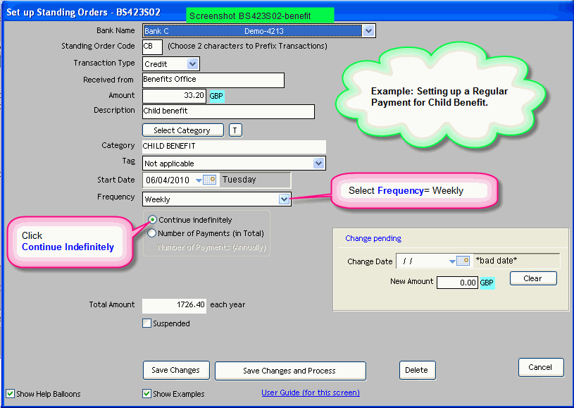 Setting up a regular income record for Child Benefit The data entry for this option is shown here: Screenshot-BS423S02-benefit