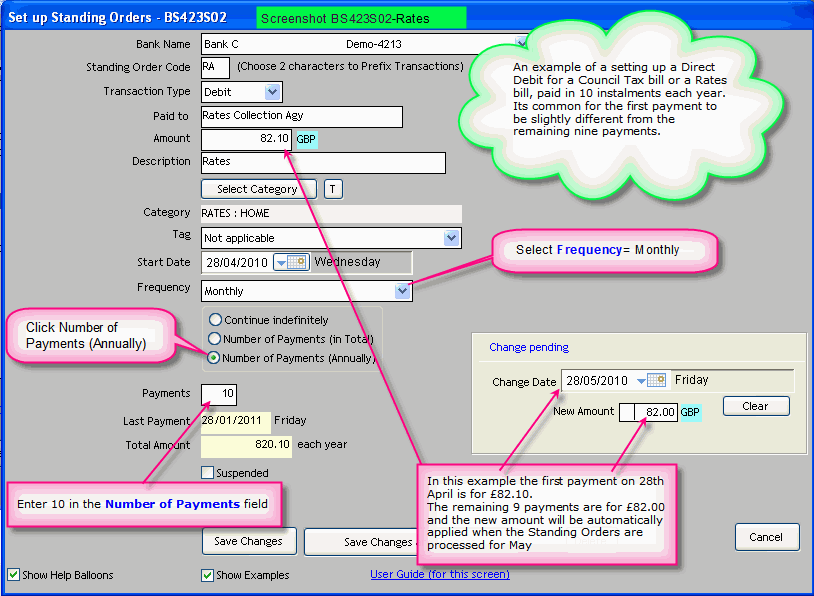 This example shows how to set up a Standing Order for a Council Tax bill or a Rates bill. The total amount is indivisible by 10. Nine equal payments are drawn from